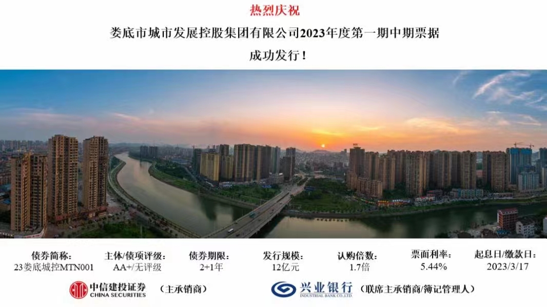 3月17日,市城發控股集團2023年第一期中期票據成功發行,規模12億元,發行期限2+1年,票面利率5.44%。